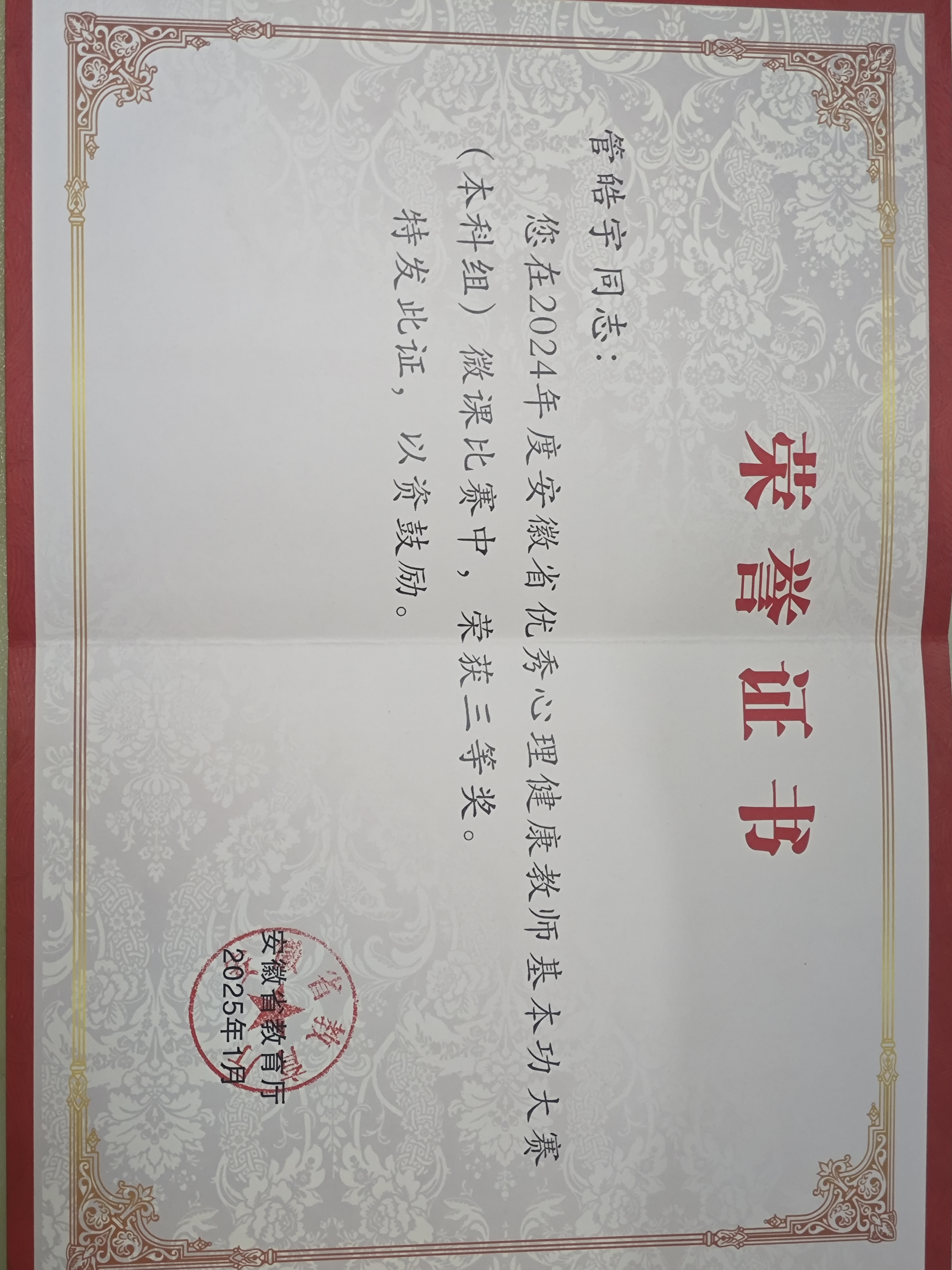管皓宇老师荣获安徽省心理健康教师基本功大赛三等奖