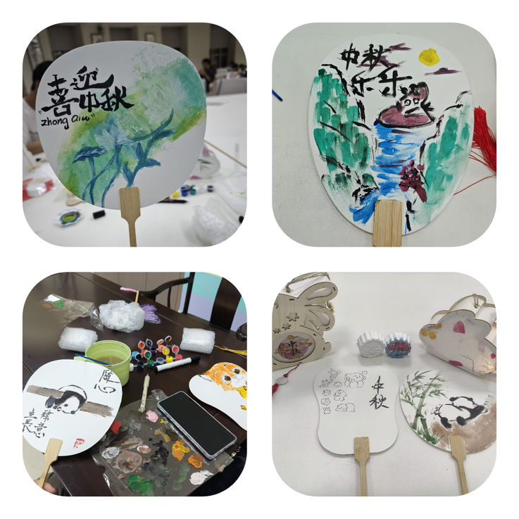 团扇绘制现场气氛热烈。素白的团扇在同学们笔下焕发新生:工笔细描的桂枝生动灵秀,水墨氤氲的月夜山水意境深远,卡通风格的嫦娥玉兔俏皮可爱……大家以扇为纸、以情入画,将中秋之意凝于笔端。每一柄团扇都是独一无二的“中秋艺术珍藏”。不少同学计划将亲手绘制的团扇赠予亲友,让真挚情谊随扇传递。
