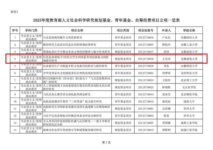 本网讯 近日,教育部社科司正式公布《2025年度教育部人文社会科学研究一般项目立项通知》,beat365在线唯一官网共有3个项目获批立项。其中,专职辅导员王昊禾申报的《信息茧房视域下Z世代大学生网络素养对创新能力的影响路径研究》成功获批规划基金项目。这是继2024年学校连获教育部人文社会科学研究专项任务项目(高校辅导员研究)项目后,再次在教育部人文社科研究项目中取得突破,填补了学校辅导员在规划基金项目类别上的空白。