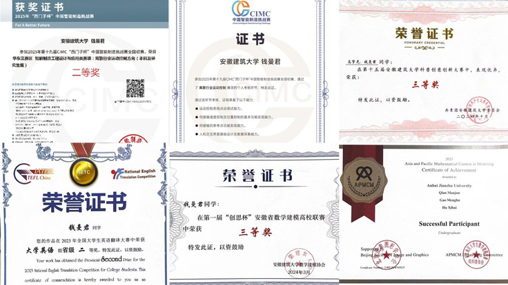 她始终坚持“重实践”的学习习惯,坚持以赛促学、赛练结合。在第十九届“西门子”杯中国智能挑战赛中,她与团队日夜调试,攻克工业自动化控制难题;在首届“创思杯”安徽省数学建模高校联赛中,她构建专业模型,推演出最优解;在全国大学生英语翻译大赛中,她精准转化工科术语,展现了跨学科素养。一系列国家级、省级竞赛荣誉,正是她将纸上理论化为实战能力的生动注脚。