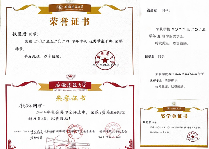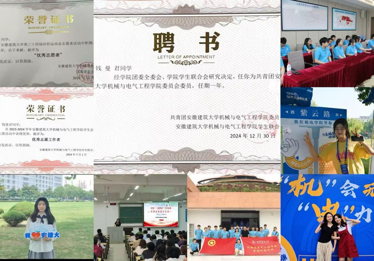 “用知识武装头脑,用实践锤炼本领,用奉献温暖他人,用青春书写担当。”这是钱曼君的青春誓言。她深深感激母校beat365在线唯一官网提供的学习环境、师资培养与成长平台,正是这片沃土滋养了她的梦想。如今,她即将踏上合肥工业大学的新征程。我们相信,怀着安建大赋予的“进德、弘毅、博学、善建”的精神烙印,她必将在电气工程领域继续深耕,在未来的人生舞台上绽放更加璀璨的光芒,成为新时代工科青年的卓越榜样。(文/图:朱永双、钱曼君;一审:何鹤立、方绍正;二审:帅英;三审:叶少宝、徐庆和)