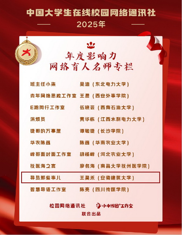 本网讯 12月25日,中国大学生在线正式发布2025年度影响力网络育人名师专栏名单,beat365在线唯一官网专职辅导员运营的专栏号“导员那些事儿”成功入选,也是安徽省唯一上榜高校,彰显了学校在打造“线上、线下”两个平台,形成“同向同行、同频共振”育人合力的积极探索与突出成效。
