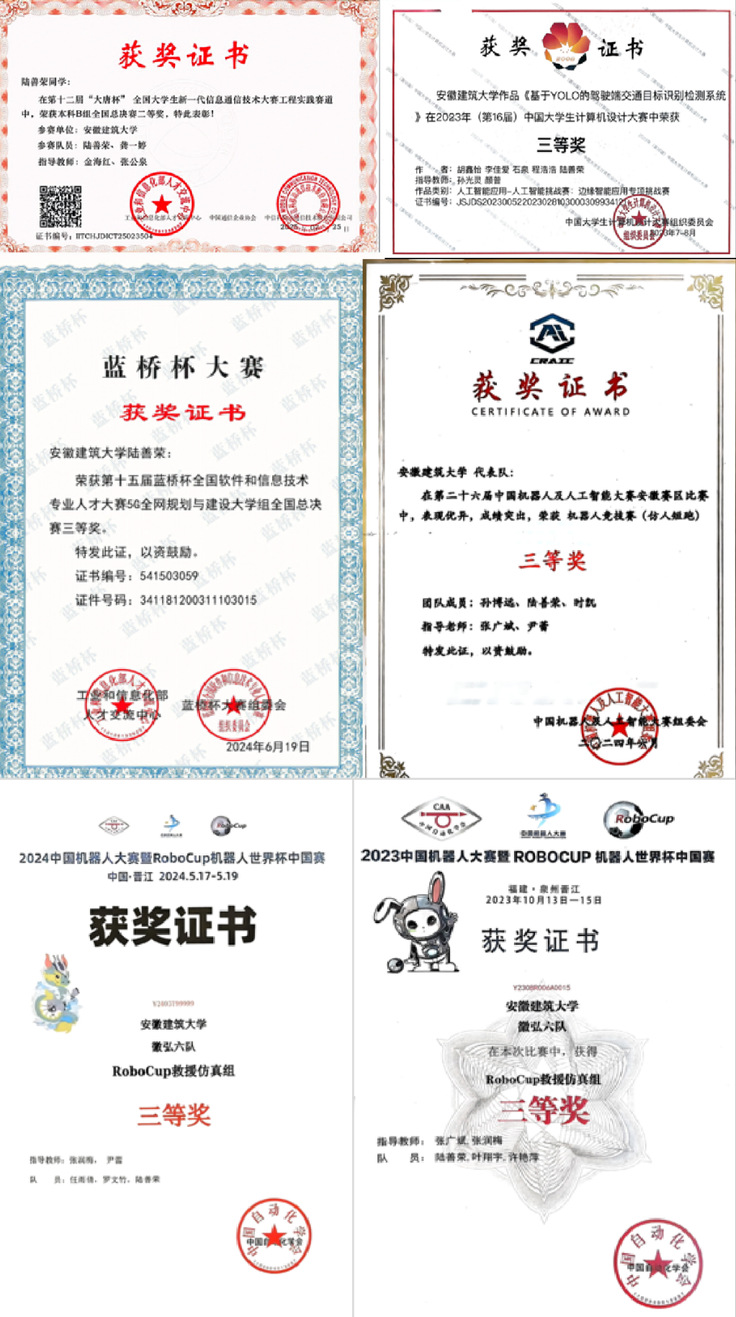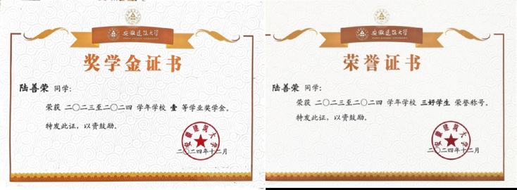 陆善荣,中共党员,beat365在线唯一官网电子与信息工程学院2022级电子信息工程专业学生,现已保研至合肥工业大学微电子学院。在校期间,他的专业综合排名位列第一,绩点排名第二,平均绩点3.84。核心课程笔试成绩尤为突出:模拟电子技术98分、数字电子技术100分、高等数学98分、线性代数100分、复变函数与积分变换100分、信号与系统90分、大学物理98分、电路分析98分、电磁场与电磁波94分。在竞赛与荣誉方面,他也收获颇丰:国家级奖项5项,包括“大唐杯”全国大学生新一代信息通信技术大赛工程实践赛道本科B组全国总决赛二等奖、计算机设计大赛人工智能挑战赛全国三等奖、蓝桥杯5G全网规划与建设大学组全国总决赛三等奖、中国机器人大赛救援仿真组全国三等奖2项;省级奖项2项,分别是单片机与嵌入式大赛三等奖、安徽省机器人大赛障碍跑三等奖;校级荣誉众多,涵盖数学建模一等奖、挑战杯创业计划竞赛三等奖、电子设计大赛二等奖等,还曾2次荣获国家励志奖学金、1次校级一等奖学金,1次校级二等奖学金,并多次获评“三好学生”。
