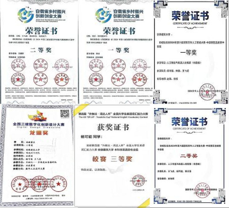 以赛促学,破茧成蝶:大二学年,杨可能在稳固学业的同时也逐渐开始涉足学科竞赛。参赛初期虽未获奖,但他以“积累经验、学习成长”为目标,吸取经验、默默沉淀。功夫不负有心人,在大二下学期事情迎来了转机。在老师的指导下,他主持申报一项国家级大创项目,同时跨学科参与一项省级大创项目,最终均以竞赛获奖、软件著作权等成果圆满结题。大三上学期,他也迎来了竞赛“丰收季”,与团队合作斩获第十四届“毕晟杯”全国大学生电子设计新技术创新应用竞赛一等奖、第六届国际青年人工智能大赛中部赛区一等奖、全国三维数字化创新设计大赛省特等奖等多项省部级以上奖项。其中,在“毕晟杯”决赛期间,他顶住专业课学习、课程实验与科研项目的多重压力,在老师指导下日夜攻坚,最终在北京航空航天大学的赛场摘得荣誉,让努力有了最耀眼的注脚。