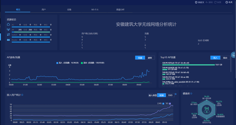 “十四五”期间,学校以“高速、稳定、全覆盖、智能化”为目标,持续加大信息基础设施投入,构建起一张覆盖全域、技术先进、安全可靠的网络“大动脉”。数据中心机房采用三组热通道封闭系统,实现双路可插拔PDU供电,可以满足大功率、高密度服务器部署。南北两校区采用双光纤链路互联备份,核心设备达成万兆互联,出口带宽大幅提升至 35.2G,轻松满足大规模数据传输、多终端并发访问等高频需求。实现南北校区无线网全覆盖,为线上教学、科研协作和远程办公提供了坚实网络支撑。