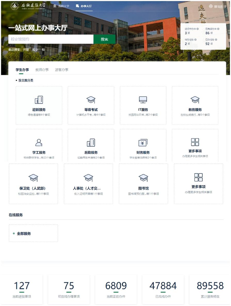 “十四五”期间,学校始终以师生体验为核心,通过流程再造与技术创新,推动校园服务实现从“能办” 到“好办”“快办”“智办” 的质变飞跃,构建起全方位、全周期、全覆盖的智慧服务生态。网上办事大厅持续迭代升级,成为智慧服务的核心载体,从初期整合高频事项、提供基础查询服务,逐步发展为功能完备的综合服务枢纽,实现73个全业务流程在线办理。移动端日均访问量达上万人次,让师生 “掌上办、随时办”成为常态。通过部署财务自助终端等智能设备,开通eduroam 全球教育无线漫游服务,全方位提升了信息化服务便捷度。校园虚拟卡全面普及,实现食堂消费、门禁通行、图书借阅、电费缴纳等场景“一码通办”。学校已构建覆盖学生“入校-在校-离校”的全链条服务体系,一体化平台整合学业、心理、资助等数据,建立了11类预警模型,基于消费、借阅等数据生成学生“成长画像”。通过学校数据中心,门禁系统与学生处、保卫处、学院辅导员实现联动,对晚归学生进行预警。