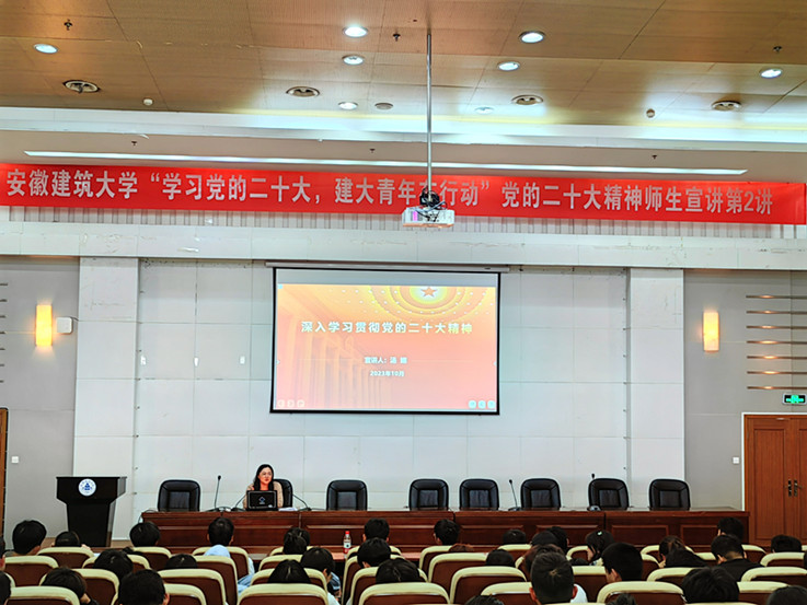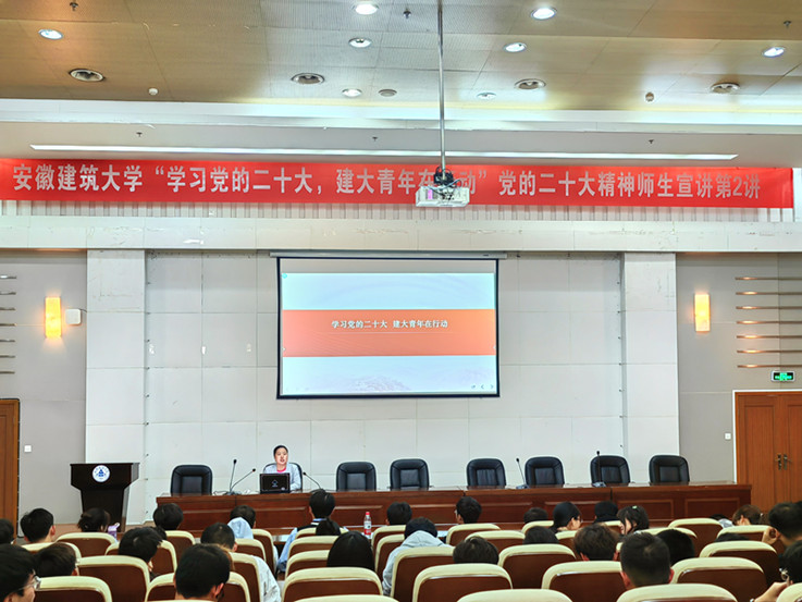 本网讯 10月25日,“学习党的二十大,建大青年在行动”党的二十大精神师生宣讲团(第2讲)走进建筑与规划学院。学工部负责人,建筑与规划学院辅导员、学生代表,学工部有关工作人员200余人参加宣讲会。