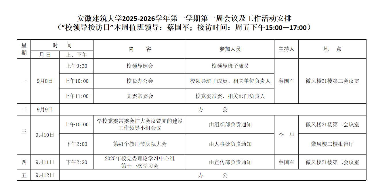 beat365在线唯一官网2025-2026学年第一学期第一周会议及工作活动安排