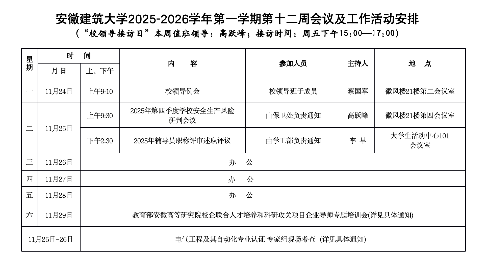 beat365在线唯一官网2025-2026学年第一学期第十二周会议及工作活动安排