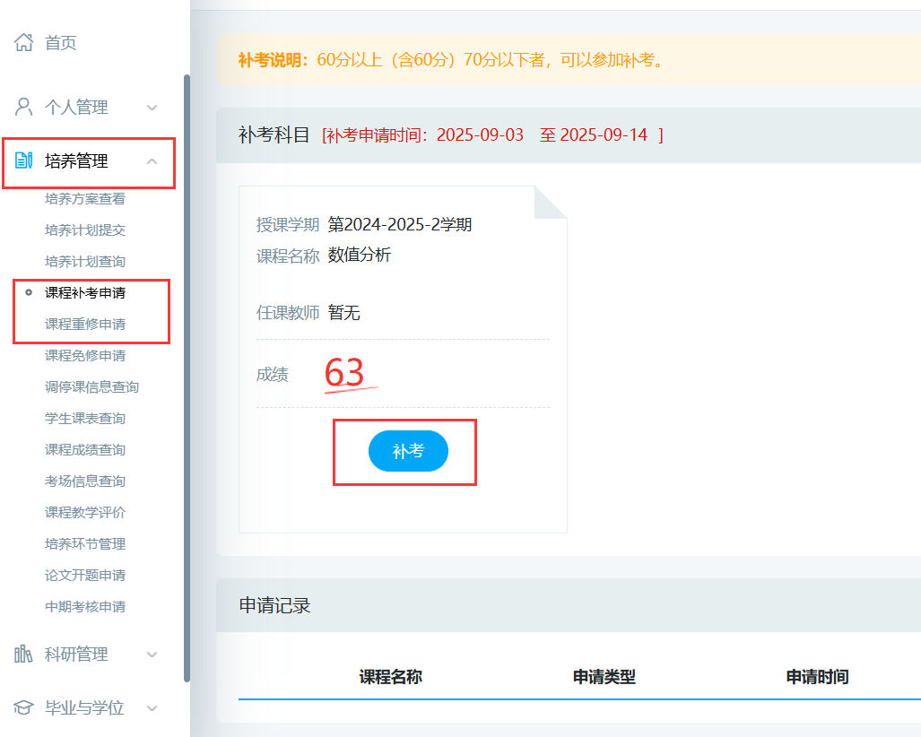 根据研究生院学期工作安排,2025-2026学年第一学期全日制硕士研究生期初补考安排如下,请各位需要补考的研究生,首先在研究生教育管理申请补考,未在系统申请补考的学生,无补考成绩。重修课程为本学期能开设的课程,请在9月14日前在系统里申请。