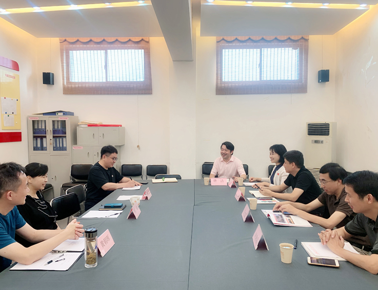 本网讯 7月19日下午,合肥市文旅局产业发展处丁大文处长一行来我院调研考察数字媒体创意的教学与实践活动。艺术学院副院长邢瑜热情接待并主持了座谈会,参加座谈的有包河区文产办副主任钟晓东、中国科技大学新媒体研究院副院长朱明辉、安徽数字产业联盟秘书长周芳、包河文化产业投资集团副总经理唐洁,以及艺术学院副院长黄朝晖,动画系副主任张抗抗。