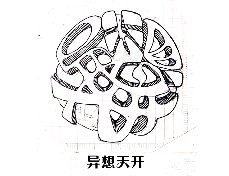 19视觉传达专业余秋瑭的作品《异想天开》,是成语“异想天开”的创意设计。作品在保持了字体的可识别性的基础上对整体进行变形组合,并对其进行立体化变形。画面整体构图效果融合了“迷宫”与“大脑”的艺术形象,用“异想天开”的汉字打造了一座思维迷宫,象征着青年人用“异想天开”来打破常规、突破创新的内涵。