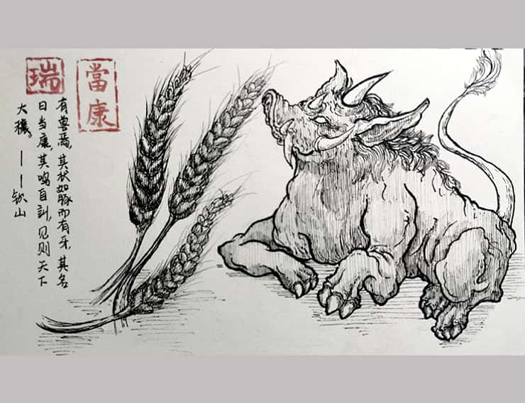 20级环境设计专业殷嘉懿的作品《当康》,以绘画的形式来表达汉字“瑞”。该作品将“王”这个偏旁化作三棵麦穗,右边的部分则是代表丰收的瑞兽当康。作品表达了对袁隆平先生的敬意与怀念。