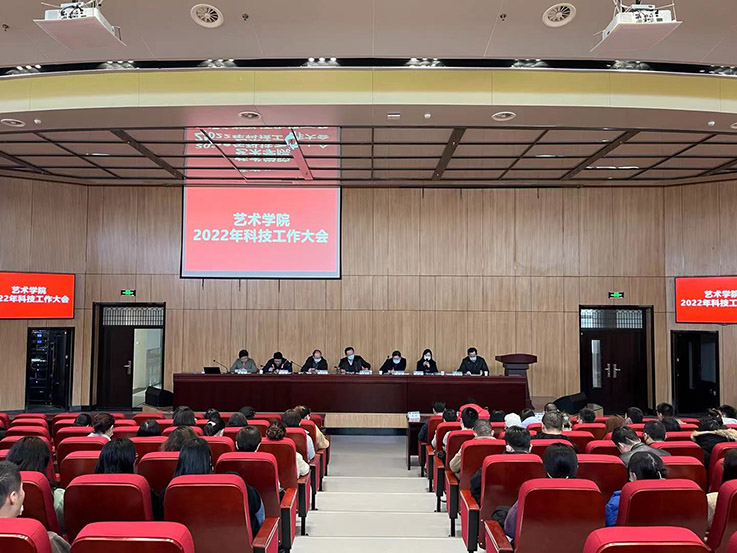 本网讯 3月23日下午,艺术学院2022年科技工作会议在实训楼二楼报告厅召开。校党委常委、副校长蔡新立出席并讲话,科技成果转化中心、科技处负责人,艺术学院党政领导、科研骨干、科研平台与科研创新团队成员、青年博士、研究生代表等参加会议,会议由黄朝晖副院长主持。