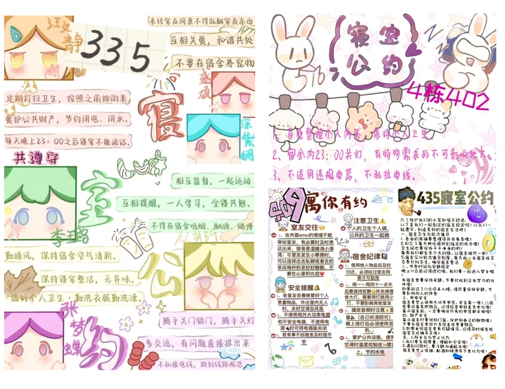 寝室不仅是同学们学习和生活的空间,更是承载着青春与友谊的温馨家园。室友们在共同设计和布置寝室的过程中,体会到互助协作的精神和团结合作的力量,制定《寝室公约》,营造温馨、和谐的学习和生活空间。