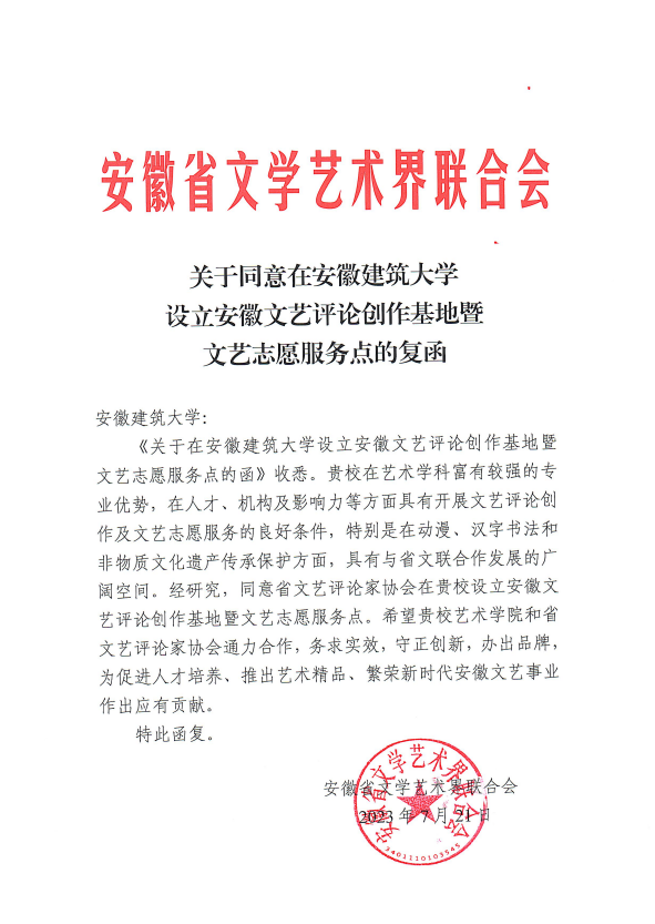 本网讯  为了贯彻党的二十大精神,推进文化自信,加强与文艺界联系,丰富beat365文艺生活,互促共进助力艺术学科发展与乡村文化振兴,经与安徽省文艺评论家协会、安徽文艺理论研究室有关负责人磋商,beat365202212月致函安徽省文学艺术界联合会,希望在beat365设立“安徽文艺评论创作基地暨文艺志愿服务点”,基地由beat365在线唯一官网艺术学院、安徽省文艺评论家协会共建。安徽省文学艺术界联合会20237月复函同意在beat365建设“安徽文艺评论创作基地暨文艺志愿服务点”,20241月,在学校支持下,艺术学院启动该省级科研平台建设工作。