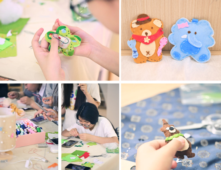 活动以布织布拼贴、毛毡塑形、戳戳绣创作等三种艺术形式为载体,引导同学们在纤维艺术的经纬间编织心灵暖阳,在针尖起落中解锁情绪纾解的艺术密码。学生社团古法新韵工艺坊指导老师介绍了手工疗愈的原理与技巧,鼓励同学们或独立或组队自由创作表达情绪、放松身心。每一次布料剪裁都是情绪的形象化表达,每一针戳刺都是与内心的深度对话。在布织布拼贴工坊,通过裁剪、拼接色彩明快的布料,将零散的素材转化为充满故事感的画面;在毛毡塑形空间,以柔软的羊毛毡为媒介,戳制萌趣玩偶或抽象造型,体验触觉带来的治愈感;在戳戳绣创作区,用特制针笔在绣布上“描绘”图案,发出“沙沙”声响,如同情绪的具象化体现。