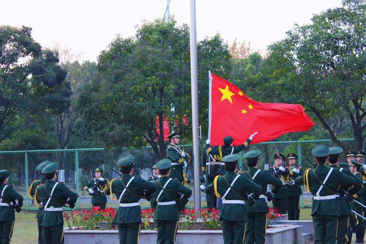 伴随着激昂的《义勇军进行曲》,校国旗护卫队护送国旗入场,全场肃立行注目礼、齐唱国歌,国旗冉冉升起,爱国之情在操场激荡。