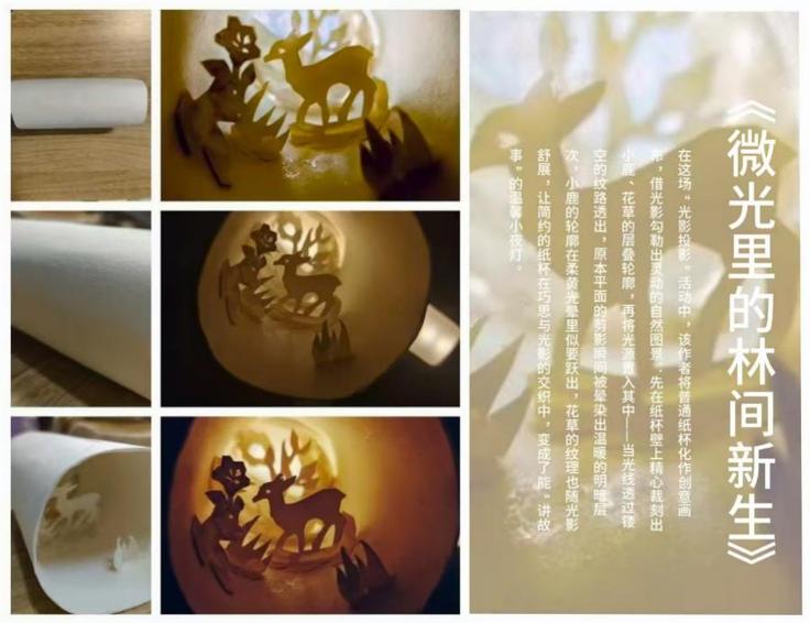 “万物向光·自然焕彩”光影设计活动鼓励学生以简单材料探索光与影的艺术魔力。同学们围绕“生命力”主题,在纸板上镂刻、绘制出向阳的向日葵、逐光的蝴蝶、破土的新芽等积极意象,再利用光源与自制投影装置,将图案投射于墙面。通过不断调试角度与距离,让光影下的自然元素焕发出清晰而动人的细节。学生通过形态塑造与光影构图,传递“追光而生”“向上成长”的精神内涵,实现了自然之美、艺术之趣与积极心的有机融合。