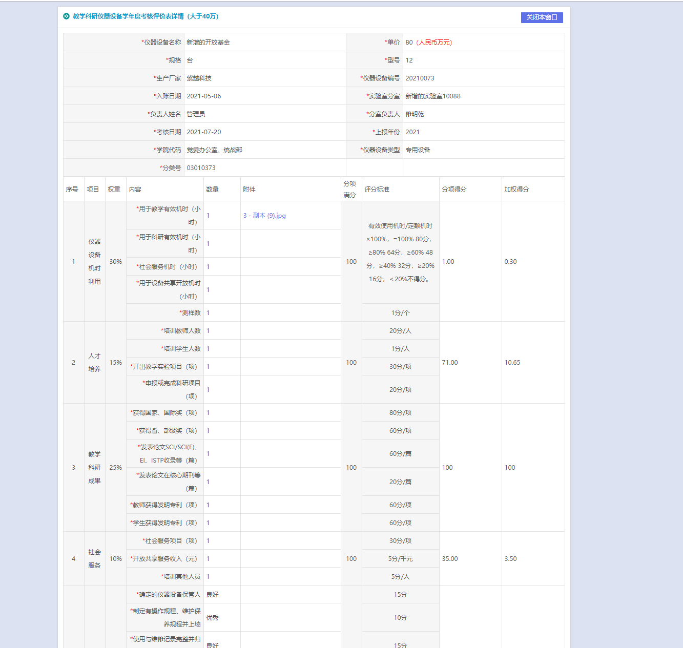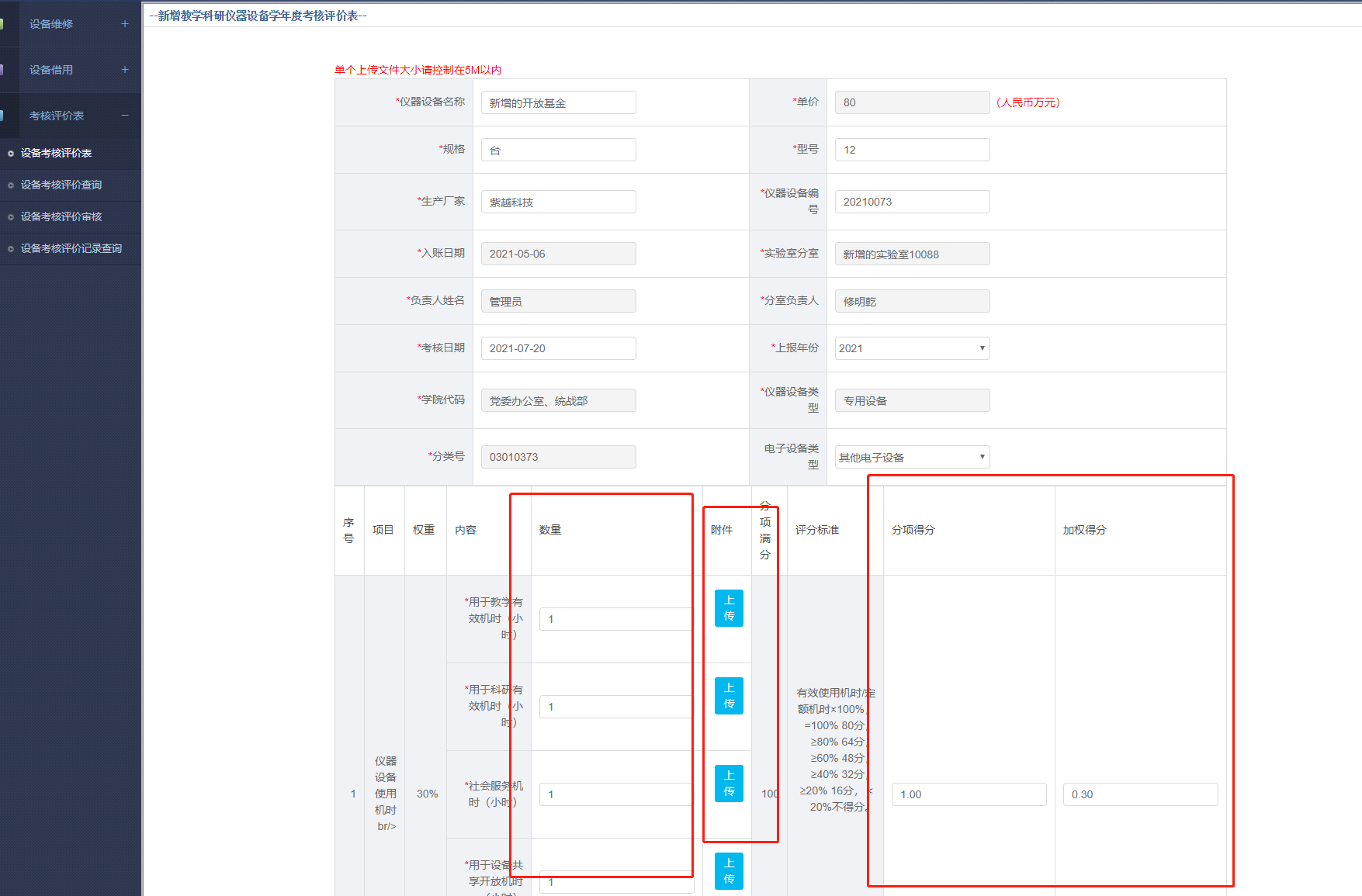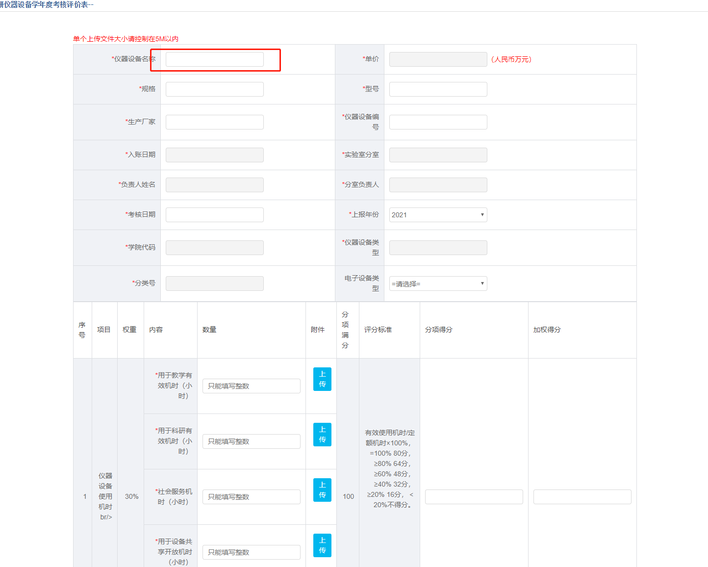 数量这一列,按照评分标准填写即可,附件可选择上传,分项得分以及加权得分会自动计算,无需手动输入。选择的设备应为仪器类设备,分类号为,03,04,05,08打头的。若为05类仪器设备,需要添加电子设备类型。