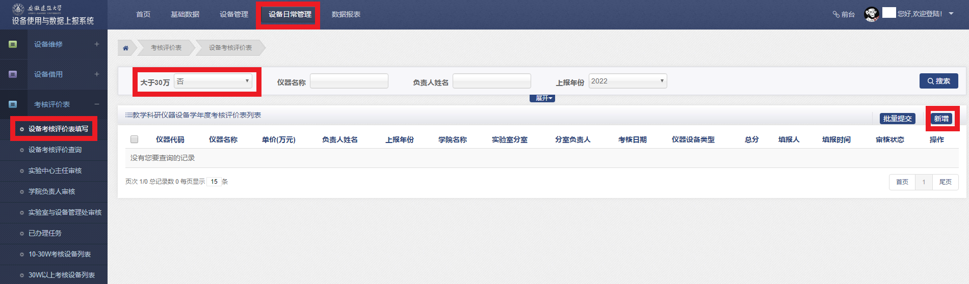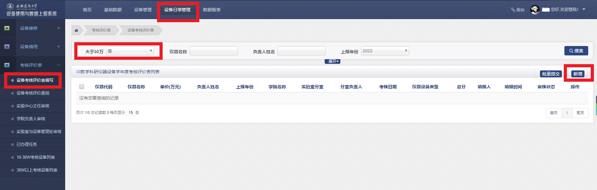 新增相关教学科研仪器设备学年度考核评价表数据,分两种情况,1:大于等于30万,点击新增按钮之前选择,要新增的是大于等于30万的设备。
