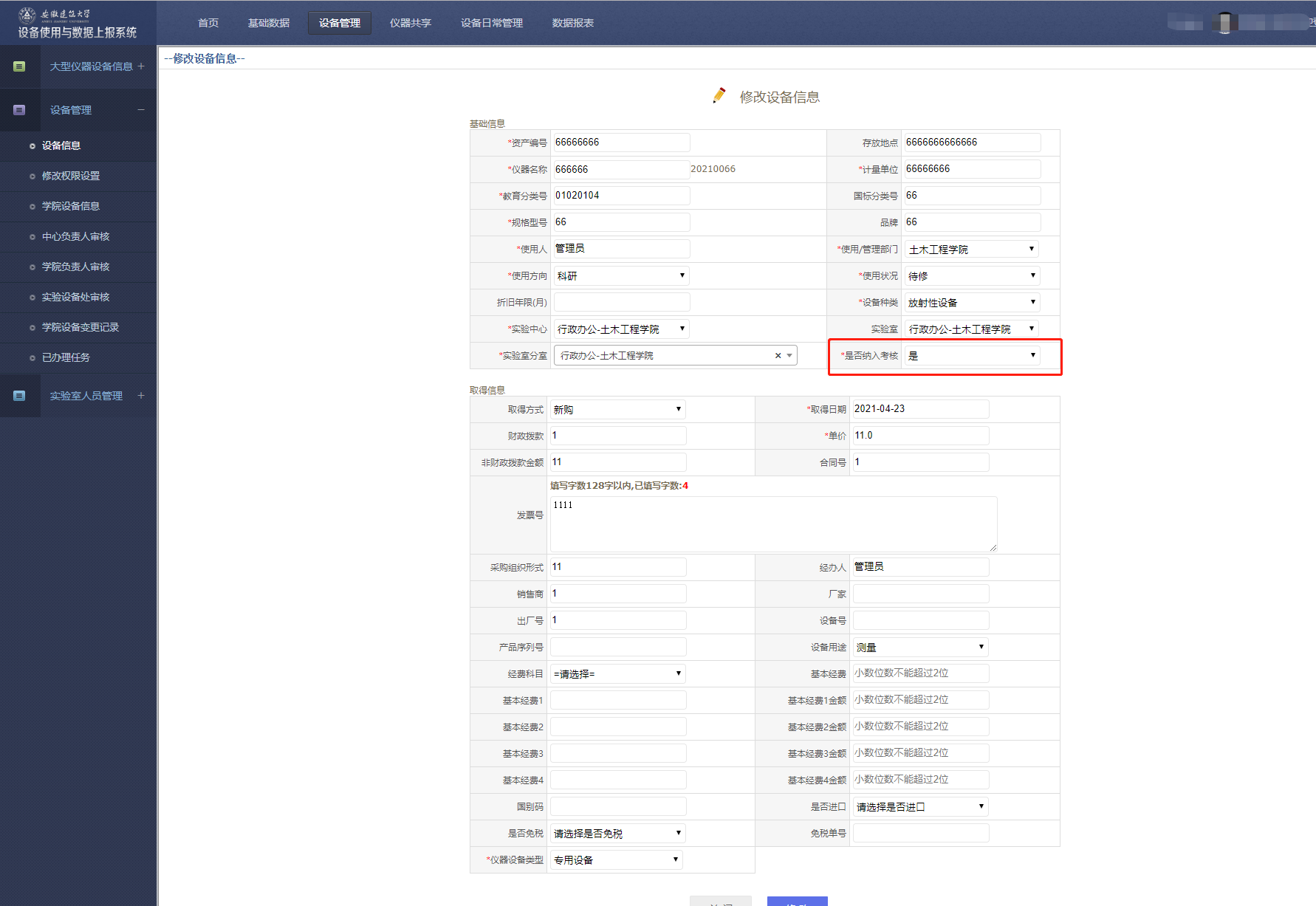 设备管理修改界面:查看是否纳入考核状态,能查询到的数据应为:入账日期小于等于当前年份,并且当前年没有添加过此设备考核数据,并且【是否纳入考核状态】为是,并且,单价在选择的范围之内。