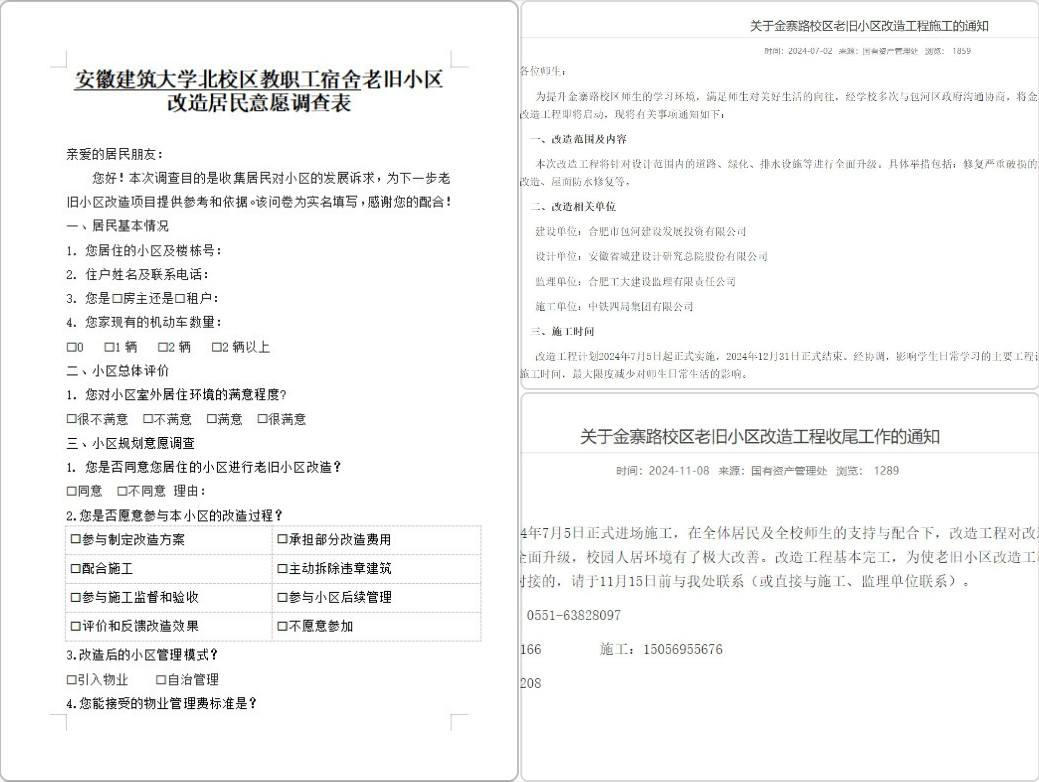 老旧小区改造关系民生福祉,要问需于民、问计于民。改造初期,学校广开言路,以调查问卷为桥,连通居民心声,以居民座谈会为媒,汇聚民众智慧。诚心倾听居民的改造诉求,力促居民深度融入改造进程,确保改造方案精准契合居民需求。改造期间,组建以党员代表、居民代表为主的居民改造小组充当老旧小区改造的“润滑剂”与“传声筒”,向居民宣传解释改造内容与进展,引导大家理解配合并积极参与。通过校园网通知、“致居民信”、反馈热线等线上线下多渠道,构建起监理监督、学校监督、居民监督 “三位一体” 的严密监督体系,严格把控施工环节,及时回应民众关切,共处理回复改造咨询与投诉20余起,居民反响积极,满意度颇高。