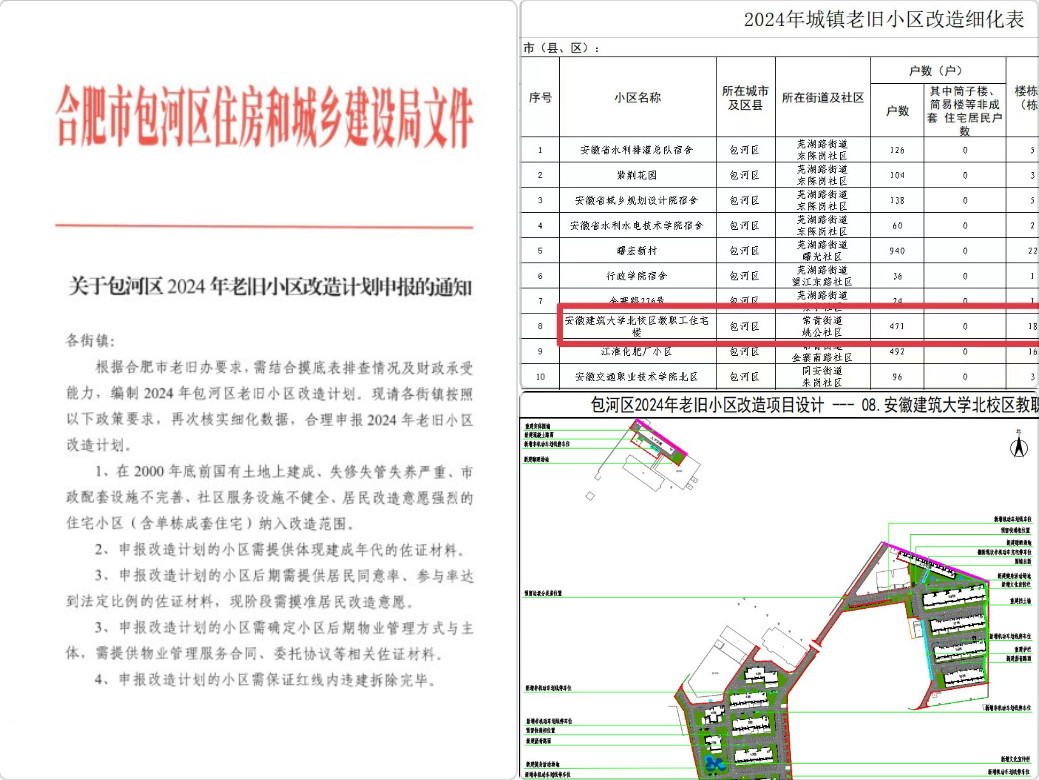 金寨路校区老旧小区改造工作获包河区政府、包河社区大力支持,校地多次召开联席会议共商改造事宜。历经前期实地调研、计划储备库申报,在多方不懈努力下,beat365在线唯一官网北校区(现更名为金寨路校区)教职工住宅楼荣跻包河区2024年老旧小区改造提升项目。改造经费由政府财政全额资助,总投资概算1716万元,对校内18栋教职工住宅楼进行改造,改造内容聚焦基础设施改造、房屋综合整治、公共设施完善、“适老化”改造四大类,涵盖路面硬化摊铺、排水改建、路灯改建、绿化整理、文娱广场、屋面防水、单元楼道粉刷等方面。