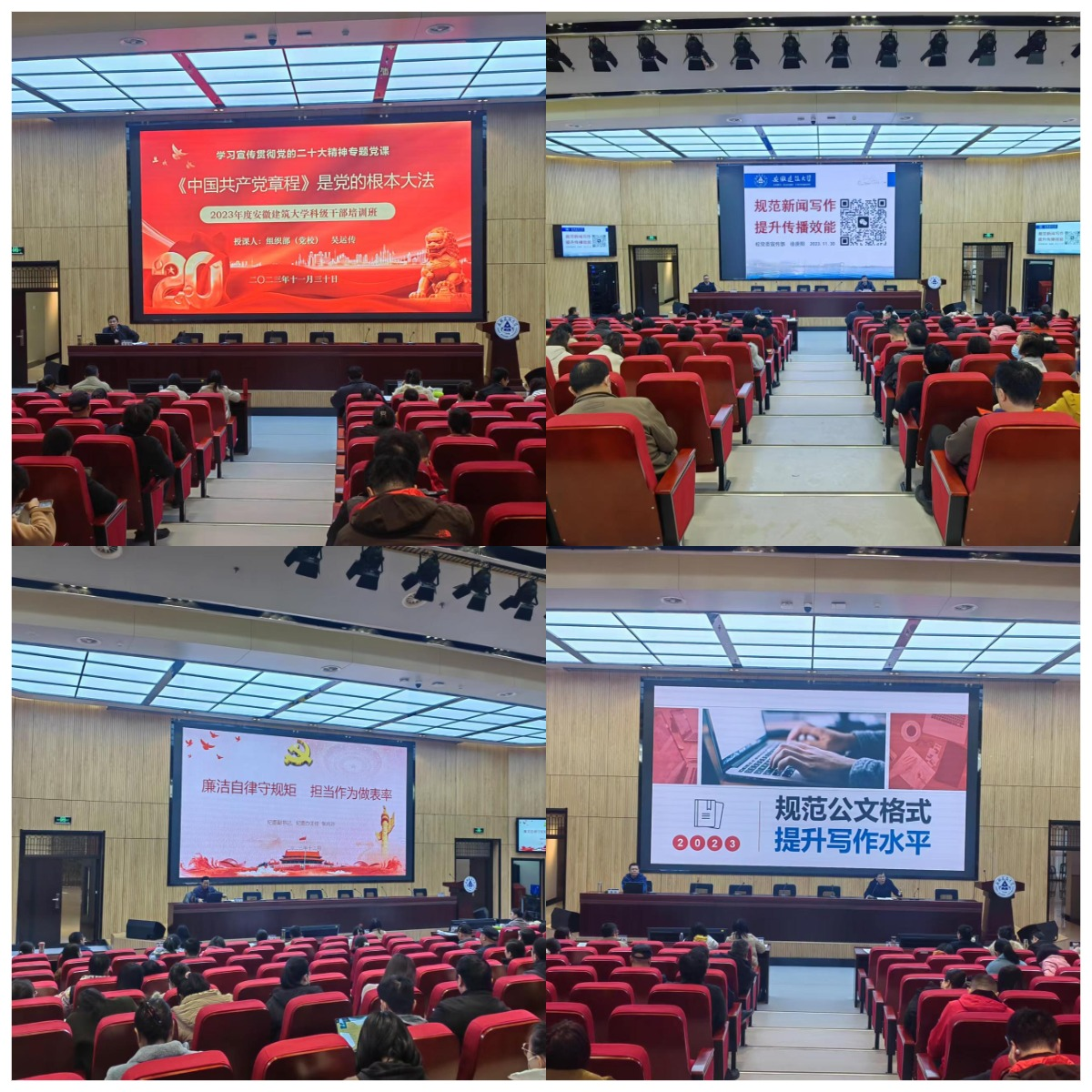 校党委常委、组织部部长吴运传以《尊崇党章 遵守党章 学习党章 维护党章》为题,校党委常委、宣传部部长徐庚阳以《规范新闻写作 提升传播效能》为题,校纪委副书记、纪委办主任张兆许以《廉洁自律守规矩 担当作为做表率》为题,校办公室副主任谢炜以《规范公文格式 提升写作水平》为题,分别为参训学员作了辅导报告。参训学员围绕学习贯彻习近平新时代中国特色社会主义思想和党的二十大精神、《坚定理想信念 做到“忠专实”“勤正廉”》等5个讲座内容,结合本单位本岗位工作实际,认真开展分组研讨;大家表示,本次培训内容丰富,针对性强,对提升学校科级干部党性修养和履职能力具有较强的指导意义,认真做到学有所获,学以致用,务求实效。