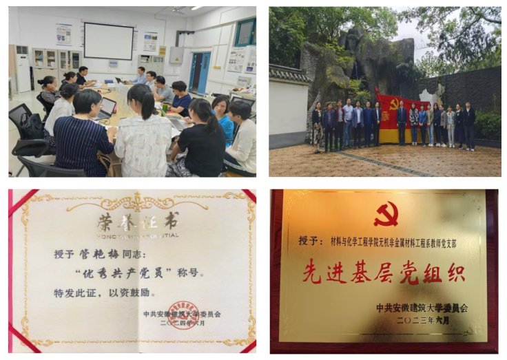坚持把党的政治建设摆在首位,强化党支部政治功能,深入学习贯彻党的二十大和二十届二中、三中全会精神以及习近平总书记考察安徽重要讲话精神,教育引导支部党员深刻理解“两个确立”的决定性意义,不断增强“四个意识”、坚定“四个自信”、做到“两个维护”。扎实开展主题教育、党纪学习教育,严格执行落实“三会一课”制度,坚持开展批评与自我批评,落实谈心谈话、民主评议党员等制度,认真组织开展主题党日活动,认真贯彻落实学校党委和学院党委的决策部署,通过集中学习、交流研讨、个人自学、网络学习、实践考察等多种方式开展政治理论学习,强化师德师风建设,切实用习近平新时代中国特色社会主义思想,武装头脑、指导实践、推动工作。2024年,支部党员管艳梅荣获学校“优秀共产党员”荣誉称号。