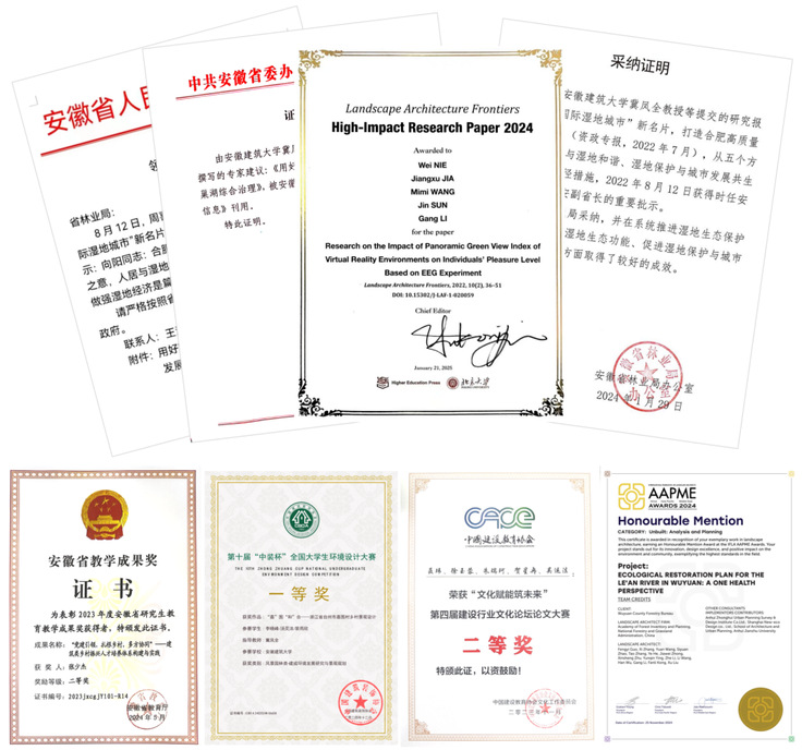 支部党员教师研究成果获得学界广泛认可。党员教师团队发表的《基于脑电实验的虚拟现实环境全景绿视率对人体愉悦度的影响研究》入选2024年度《景观设计学(中英文)》“高影响力研究类论文”,《视听交互下城市绿地鸟鸣声景对感知偏好的影响》入选中国科协科技期刊双语传播工程,并在“科创中国”平台推广,师生共创作品在国际风景园林师联合会亚非中东地区风景园林奖、建设行业文化论坛论文大赛中也取得优异的成绩。这些创新性研究为健康人居环境建设提供了重要理论支撑,展现了支部在风景园林学科前沿领域的科研实力。